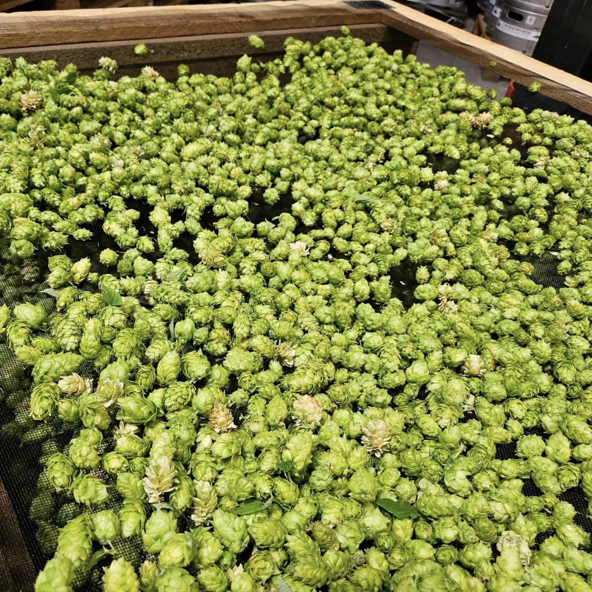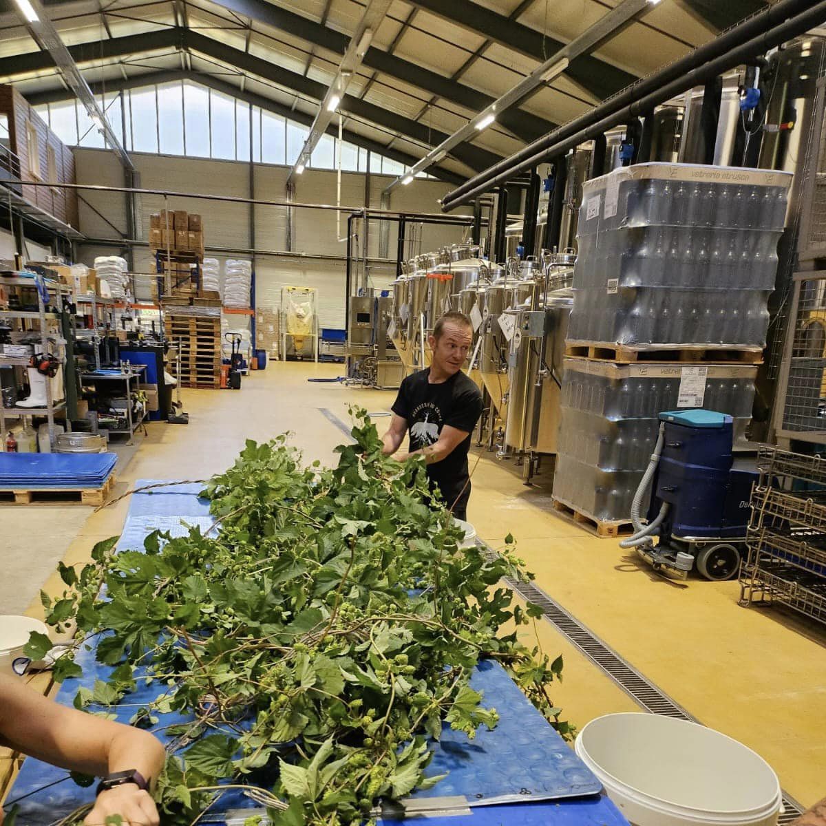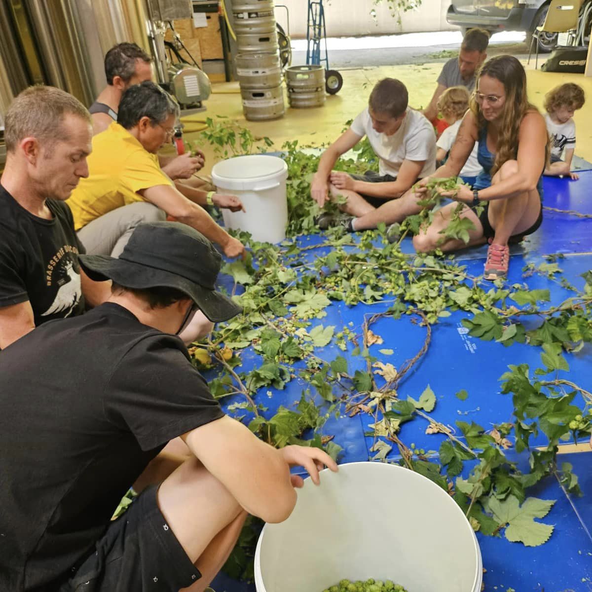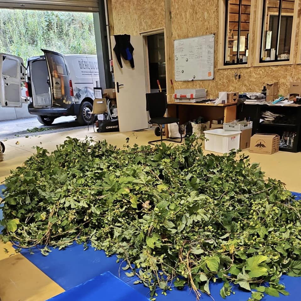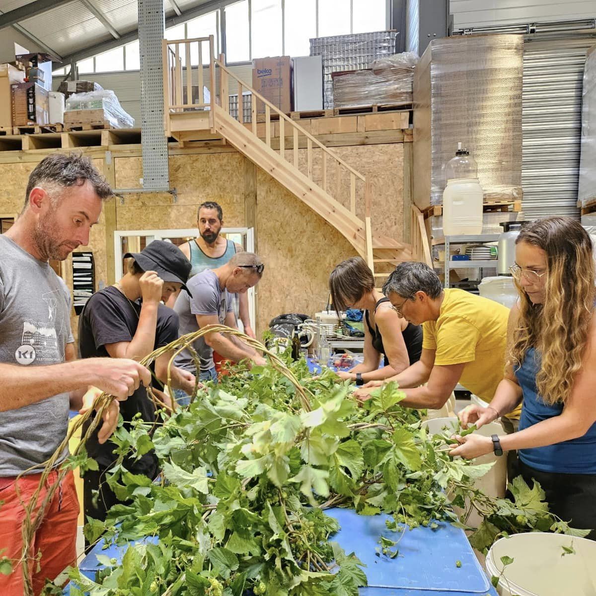 à feuiller et trier les cônes des tiges récoltées le matin ! Au total, 20 kilos de houblons frais ont été mis au frais… on a hâte d’être cet automne pour déguster notre HOP!, la bière